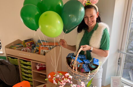 Auf der kinderonkologischen Station des Universitätsklinikums Dresden sorgten Erzieherin Diana Burow als Osterhäschen und Praktikantin Lea beim Gründonnerstagsfrühstück für einen besonderen Vormittag.