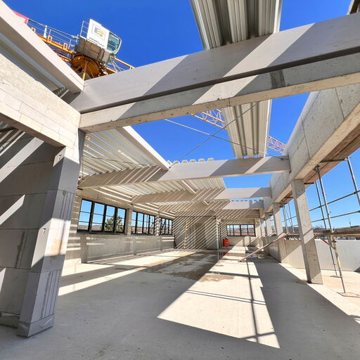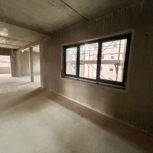 Blick aus der Vogelperspektive – unser Neubau mit frisch gedecktem Dach im Stadtgefüge. Von oben zeigt sich eindrucksvoll, wie weit wir schon gekommen sind.