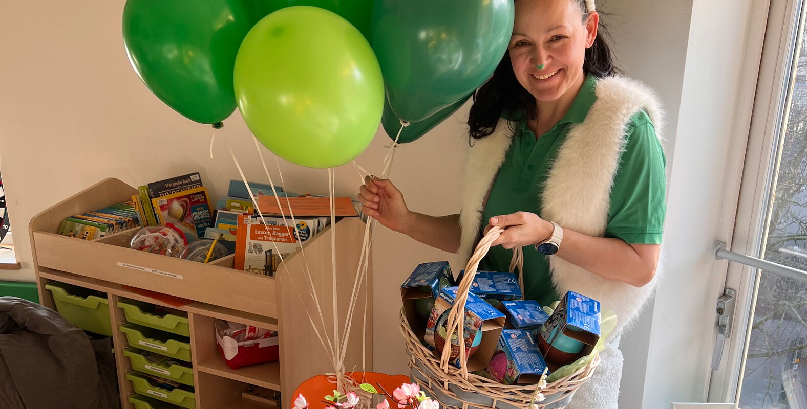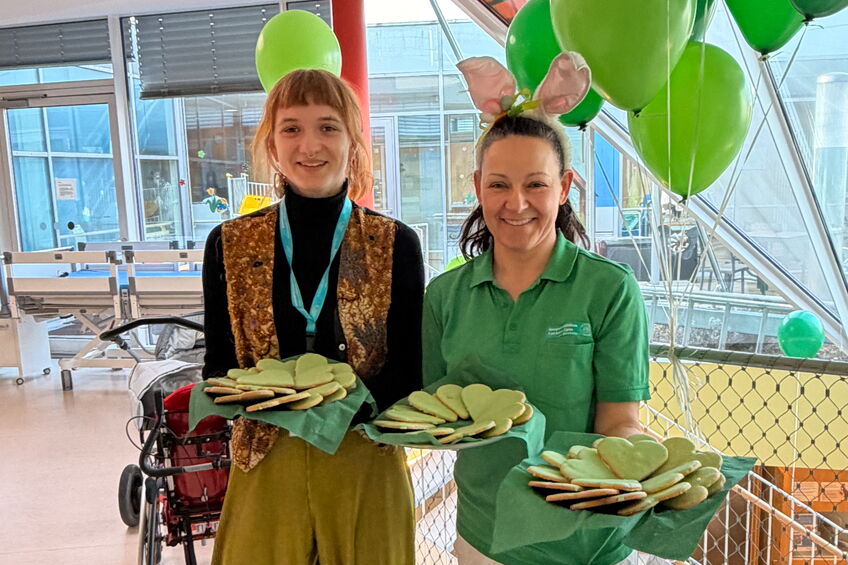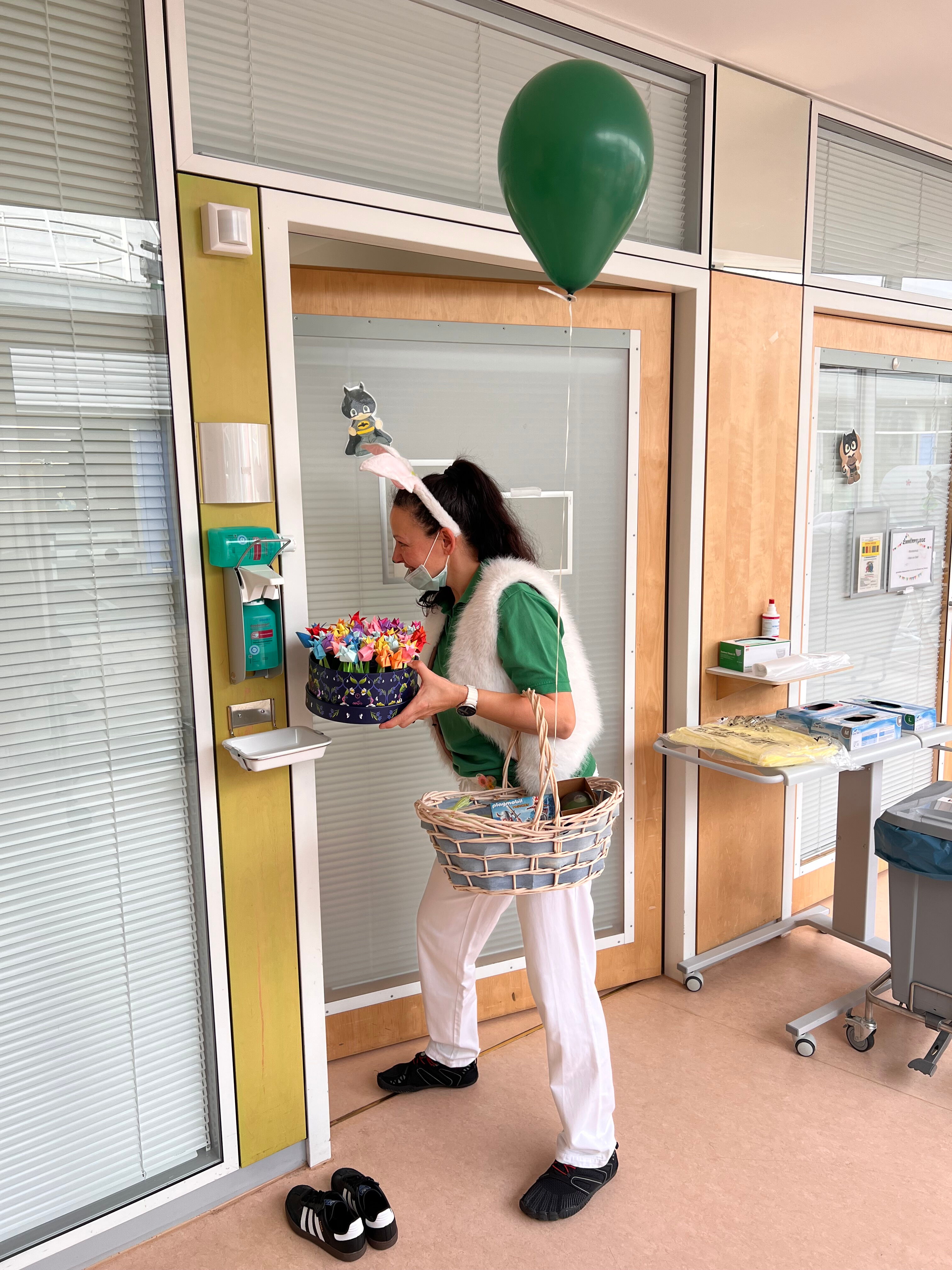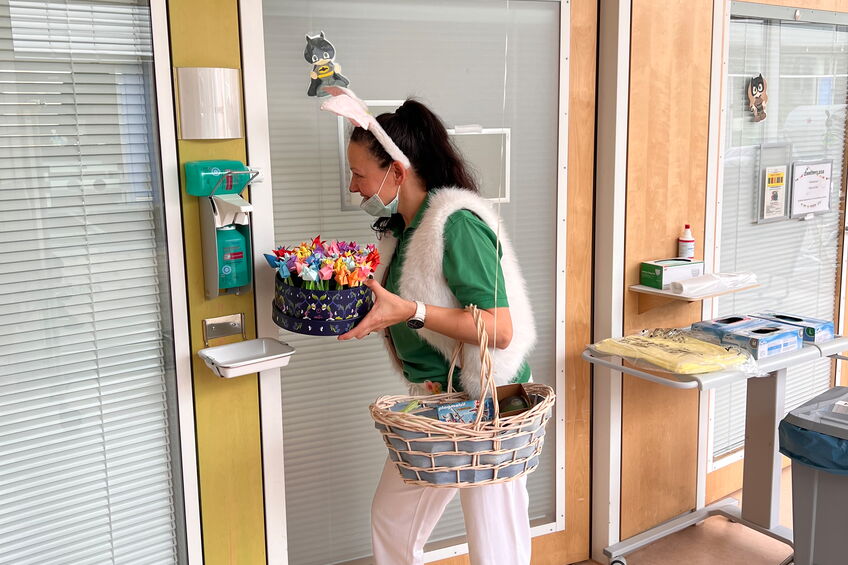 Auf der kinderonkologischen Station am Universitätsklinikum Dresden gab es auch in diesem Jahr wieder ein besonderes Frühstück zum Gründonnerstag, bei dem tatsächlich viele Leckereien grün waren. Erzieherin Diana Burow verkleidete sich als Osterhäschen und verteilte die vom Sonnenstrahl e. V. organisierten Geschenke. Sie und unsere Praktikantin Lea bereiteten den kleinen und großen Patient*innen sowie ihren Eltern damit einen wunderbaren Vormittag.