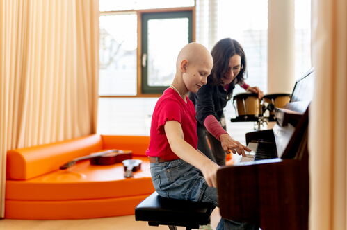 Auch außerhalb der Stationen wird Musiktherapie angeboten: für ambulante Bestrahlungspatient*innen im Musikzimmer der VILLA SONNENSTRAHL. Künftig wird dafür das neue Projekthaus HAUS SONNENSTRAHL weitere Räume und Möglichkeiten bieten.