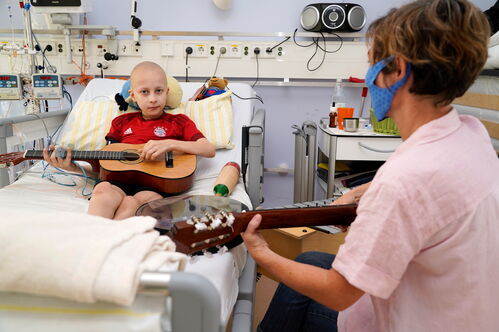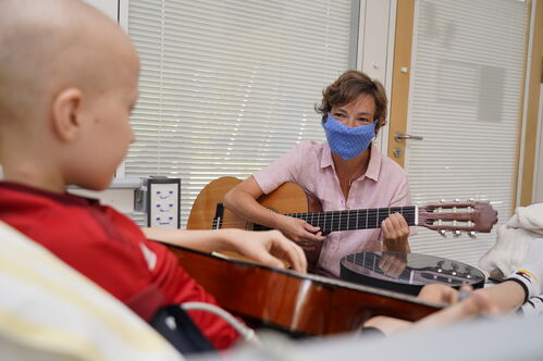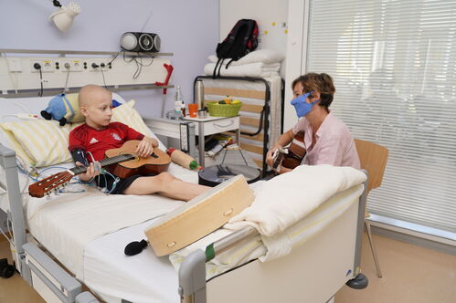 Oft fällt es Kindern leichter, sich nonverbal auszudrücken, als in Worte zu fassen, was sie bewegt. Hier setzt die Musiktherapie an: Seit 2006 ergänzt sie das therapeutische Angebot auf der Kinderkrebsstation der Dresdner Universitätsklinik und wird seitdem durch den Sonnenstrahl e. V. Dresden unterstützt.