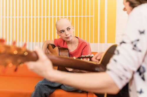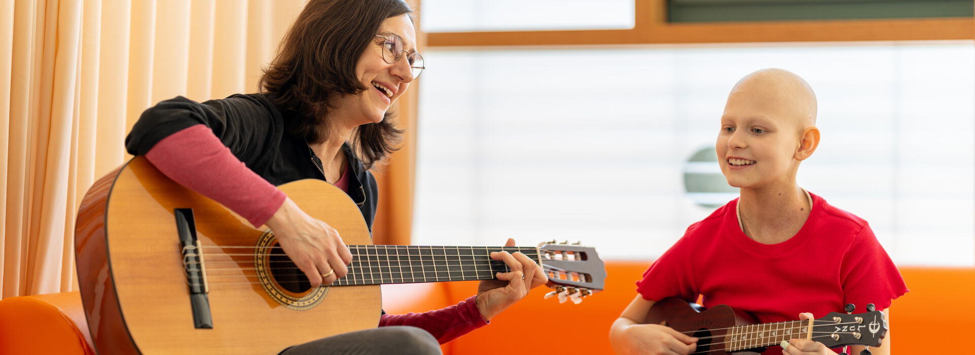 In Einzelstunden spielen und improvisieren unsere Musiktherapeutinnen Julia Grützner und Martina Bäßler gemeinsam mit den kleinen Patient*innen auf verschiedenen Instrumenten. Dazu zählen Trommeln, Rasseln, Gitarre oder Klavier, die durch Spenden über die Jahre angeschafft werden konnten. Für die Kinder sind die Instrumente oft erst einmal Spielgegenstände, deren Farbe, Form und Klang sie dazu einladen, ihre Gefühle auszudrücken. Die Therapeutinnen greifen diese musikalischen Ideen auf und verwandeln sie in gemeinsame Musik oder fantasiereiche Klangwelten – und unterstützen die Kinder so bei der Verarbeitung ihrer Erkrankung.